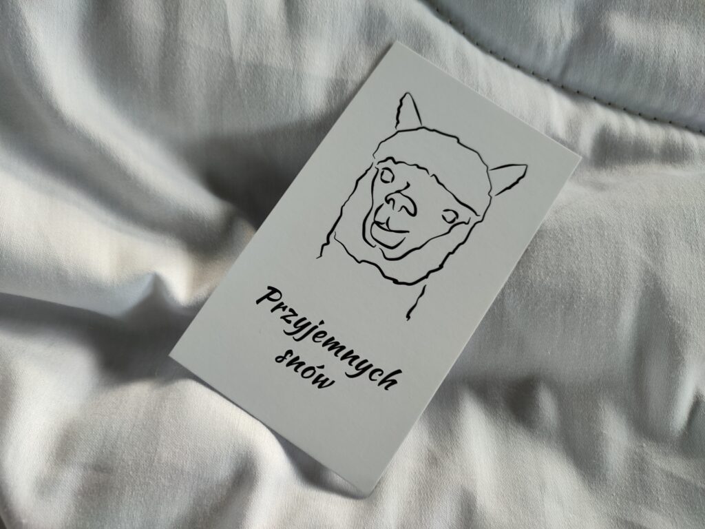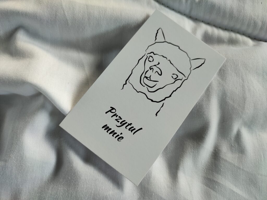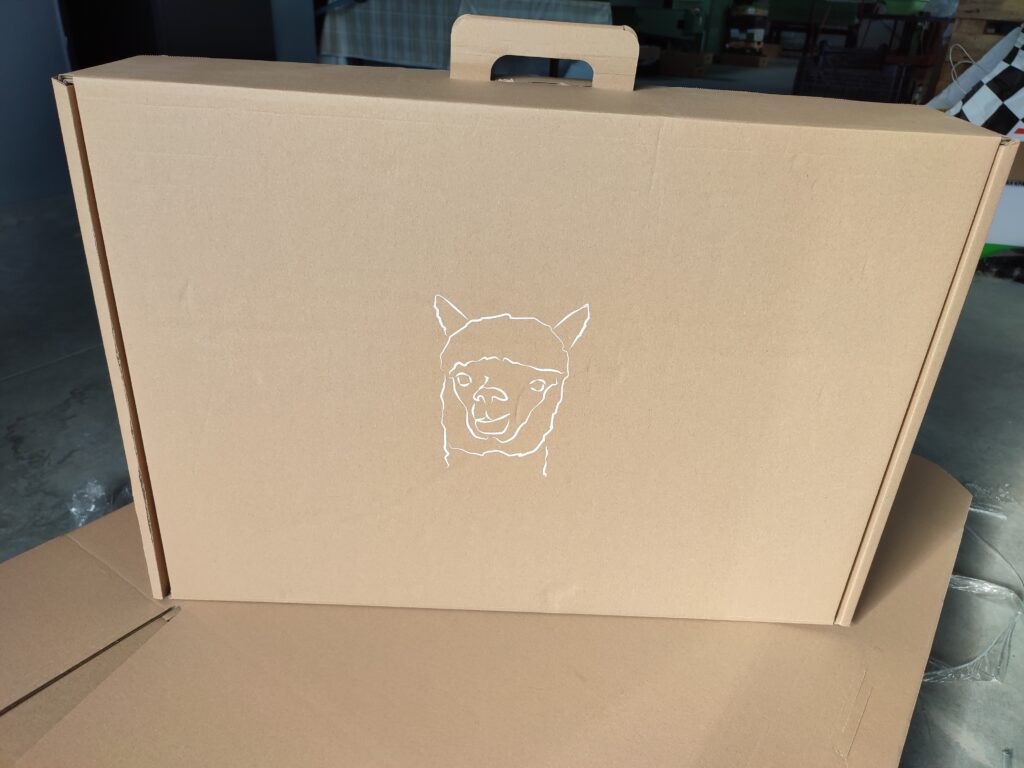 Zapakowanie w oddzielne pudełka z obrazkiem alpaki, z owinięciem bibułą oraz załączeniem etykiety tekturowej z obrazkiem alpaki.