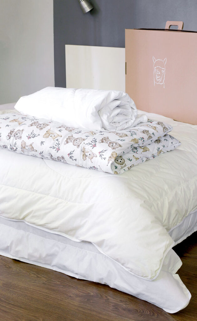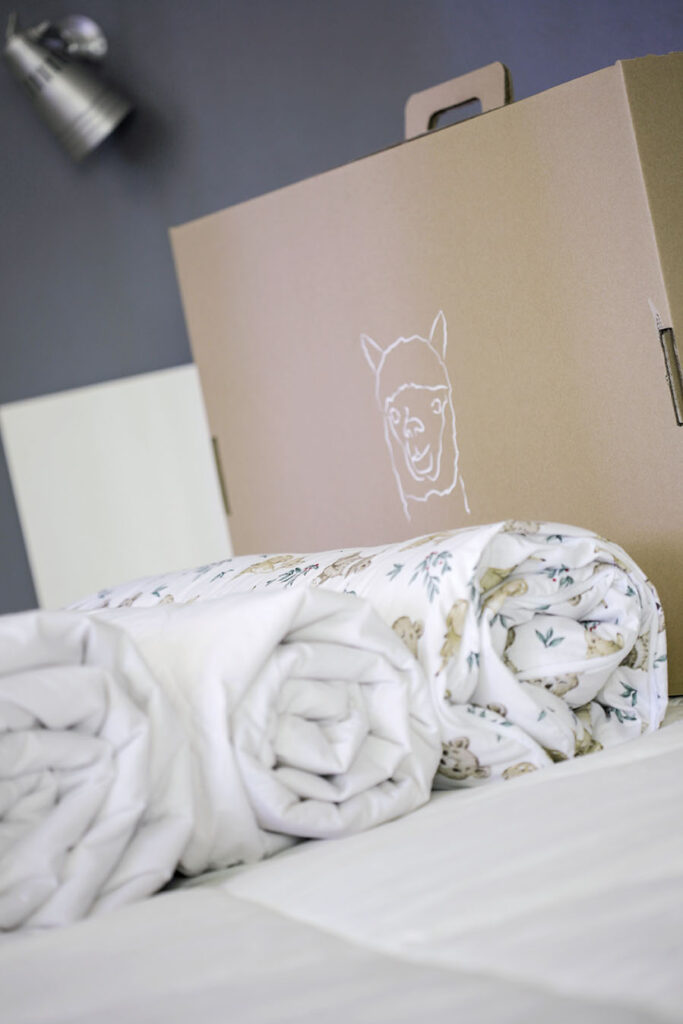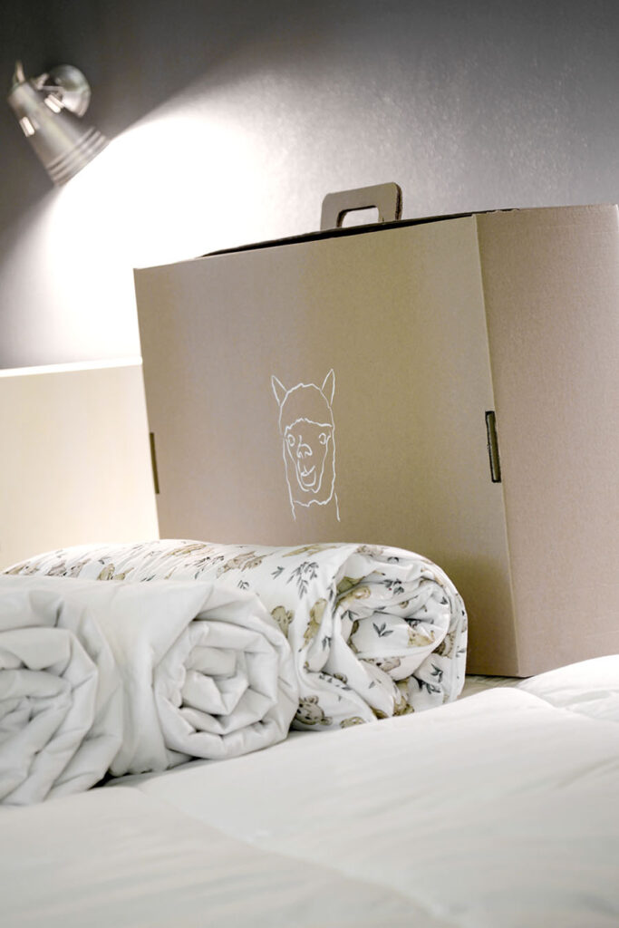 Kołdry i zestawy z poduszkami pakujemy w twarde tekturowe pudełka z obrazkiem głowy alpaki, aby ograniczać wykorzystanie folii. Opakowanie jest praktyczne i nadaje się do przechowywania innych rzeczy.